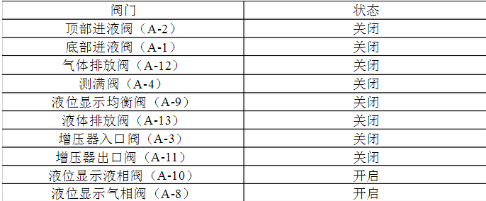 3.2.2除增壓器入口閥和出口閥(A-3或A-11)及液位計(jì)液相閥和液位計(jì)氣相閥(A-10或A-8)外,關(guān)閉所有閥門。